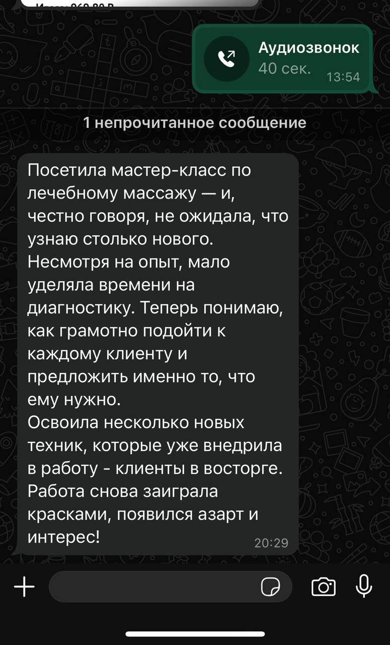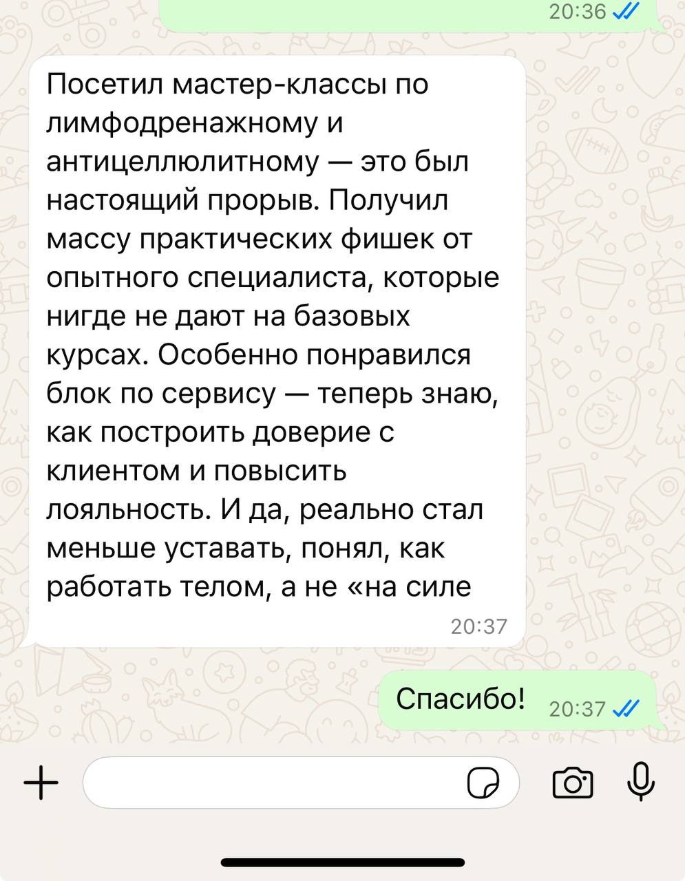 МК входит база по виду массажа, методика повышения работоспособности и метод диагностики + рабочая тетрадь со всей информацией, в том числе об оказании сервиса и коммуникации с клиентами.